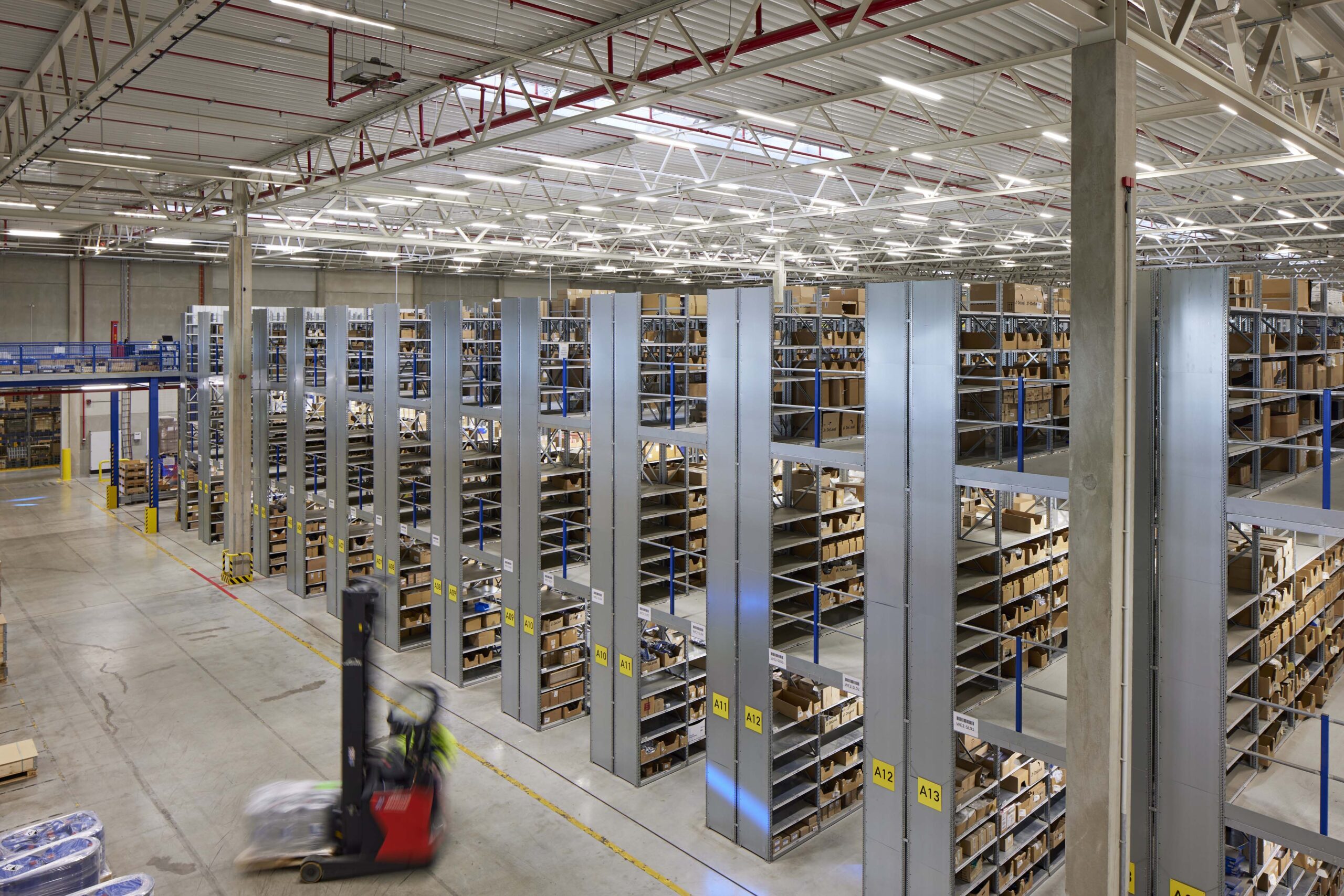 When DeLaval asked us to build a new distribution hub, the request came with a complex set of challenges. As well as needing new facilities to accommodate its growing business, the company had to store a wide range of products and materials with specialist requirements, from tiny spare parts like nuts and bolts to large robotic milking-machines that serve two cows at a time. These machines have to be cleaned with both acidic and alkaline agents, which can produce hazardous chlorine gas if they come into contact with each other.
