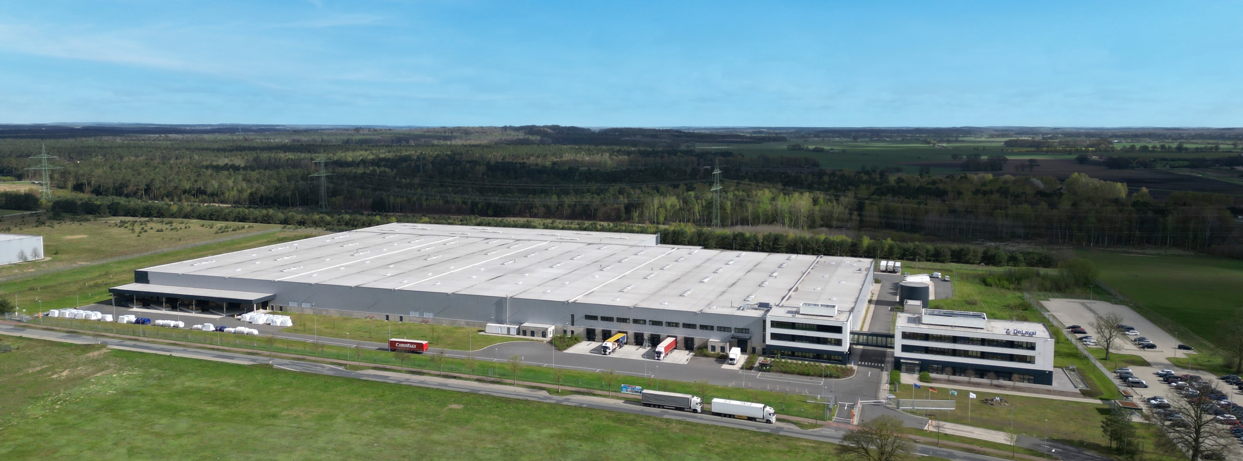 To help DeLaval boost staff retention and focus on employee wellbeing, we delivered a bespoke office building connected to the distribution centre by a bridge, with a beautifully designed cafeteria. The centre also features sports and yoga rooms, a creative room where people can read, relax or meet up with colleagues, and electric car charging points.